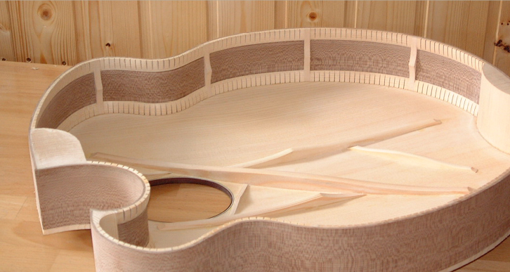 Most builders involved in archtop guitars started with the fascination for the traditional archtop instruments which is primarily based on traditional Italian violin making techniques although slightly modified but still following those principles. Obviously there is the German tradition on the German side of these instruments, using more plateau style arch. As archtop making evolved makers started to abandon the bomb-proof tank basis, the tops and backs are carved thinner the instruments in general are more refined and the sound is more open and multi-purpose. Different techniques evolved using different bracings, in some cases the braces being so light and flexible just pressed in the top, and even false concepts like top and braces cnc-d from one piece of spruce, which is completely non-valid building method for anybody with the experience of repairing cheap 19th century manufactured violins.